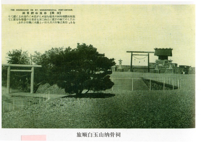 THE MAUSOKEUM ON MT.HAKUGYOKUSAN,PORT-ARTHUR.(旅順)白玉山納骨祠 旅順攻略戦で殉国の英霊を慰めんが為めに白玉山上に建てられたもので、祠の下には約二万七百勇士の遺骨を安置している。祭典は毎年6月8日いと盛大に執行される。
